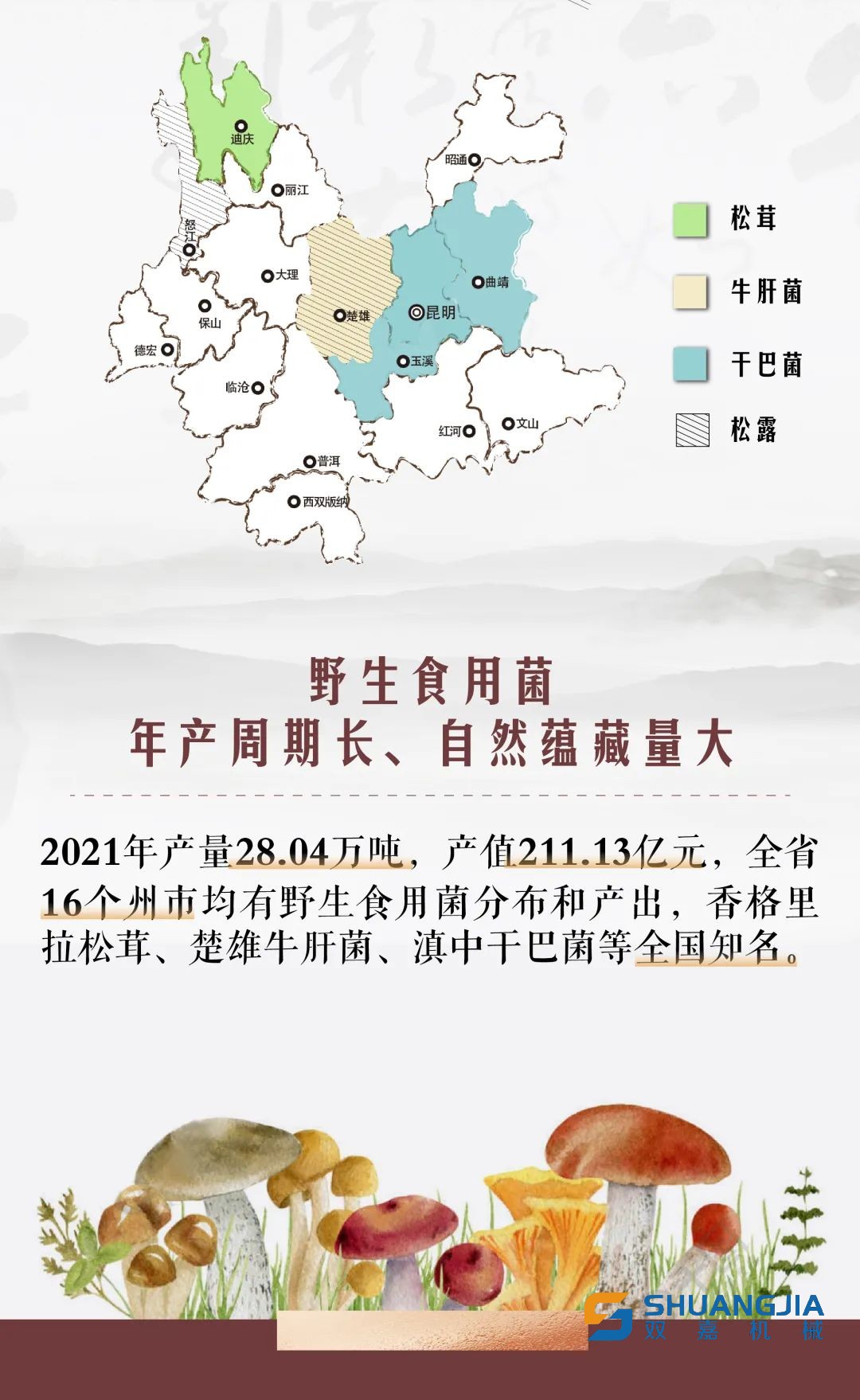 2021年,云南全省野生食用菌產(chǎn)量28.04萬(wàn)噸,產(chǎn)值211.13億元;栽培食用菌規(guī)模逐步發(fā)展,年產(chǎn)量57.1萬(wàn)噸,農(nóng)業(yè)產(chǎn)值113.8億元;云南食用菌總產(chǎn)值全國(guó)排名第二位,出口創(chuàng)匯連續(xù)20多年超過(guò)1億美元。